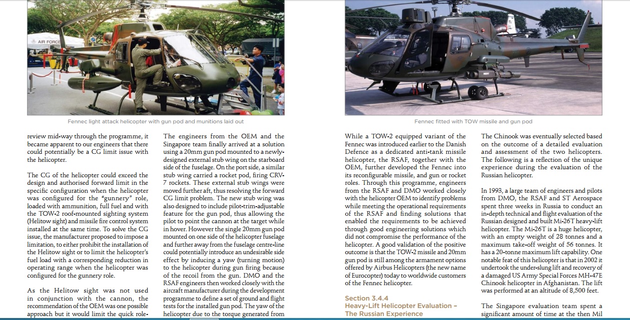 DTC50 Aviation Engineering and DTC50 System of Systems profiles lesser-known projects, such as Singapore's evaluation of the Russian Mil-26 heavy-lift helicopter as a rival to the Boeing CH-47D Chinook from the United States and having the American Stinger MANPADS square off against the Swedish RBS-70.